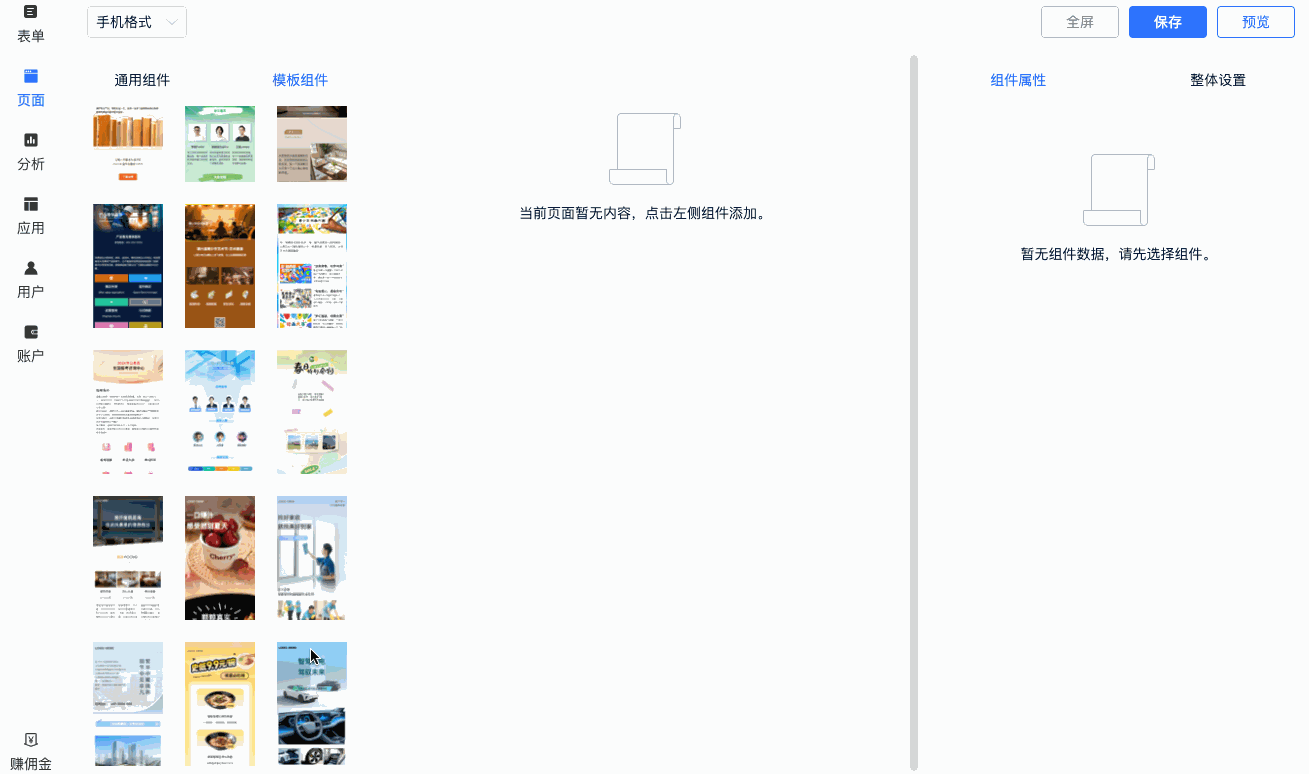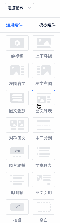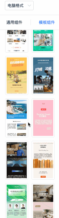 模板组件:成套的模板可直接使用,也可以结合模板增加自定义组件混搭。