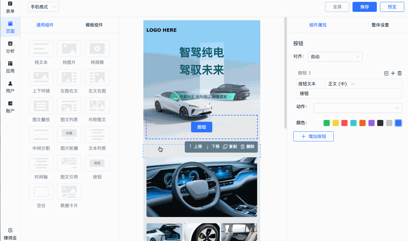 组件属性:每个组件都可以单独设置对应的组件属性,比如文本内容、字号大小、颜色、位置、上传图片、跳转链接等。