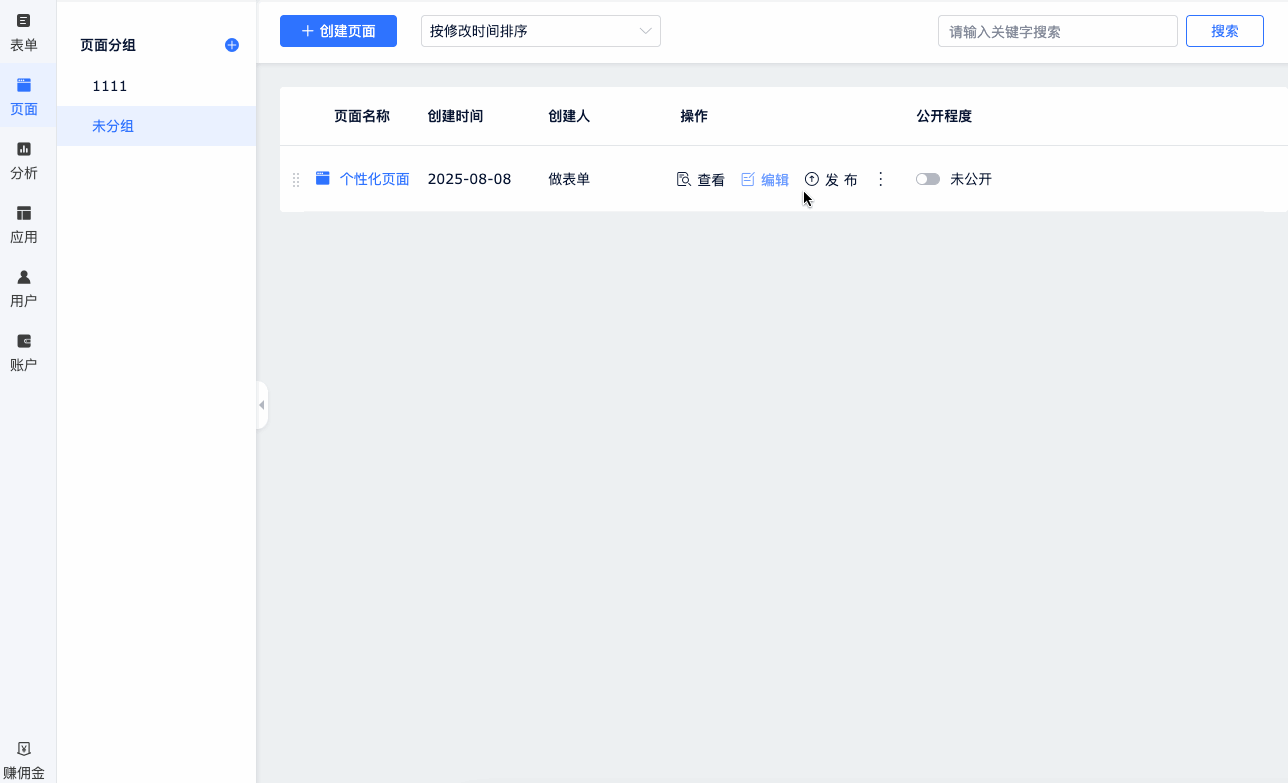 返回到页面列表,点击发布按钮,公开程度选择“公开”,即可生成链接地址与二维码,让用户可通过电脑或手机访问页面。
