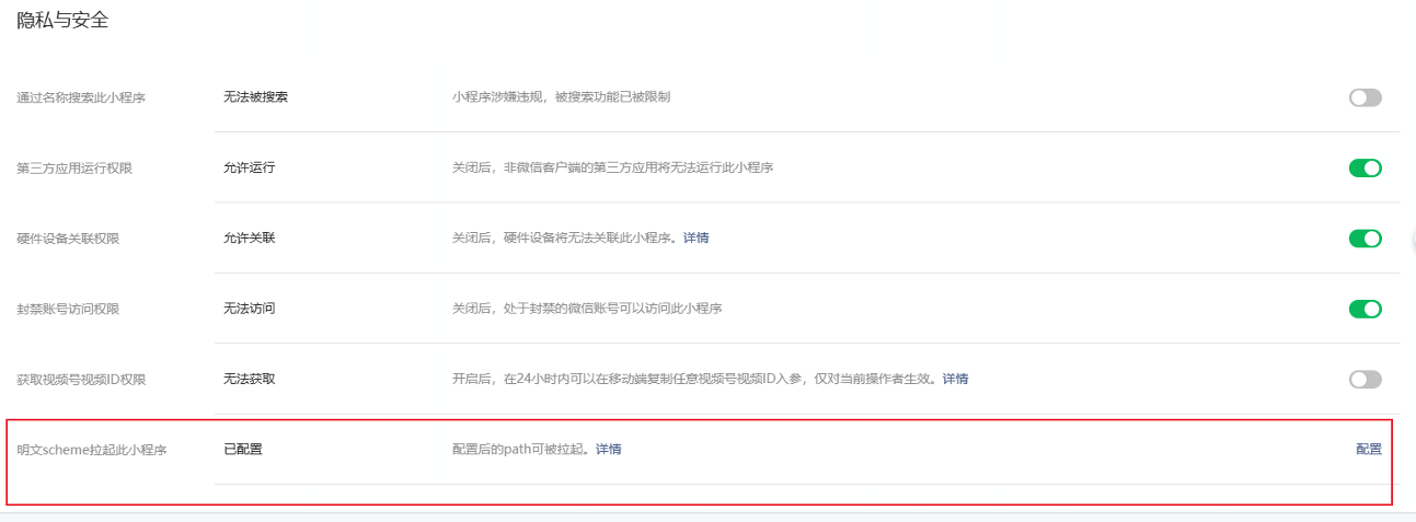 将获取的页面路径在:左下角账号 - 账号设置 - 基本设置 - 隐私与安全 - 明文Scheme拉起此小程序中进行配置,只有配置过的页面在结果页设置了才能正常跳转。